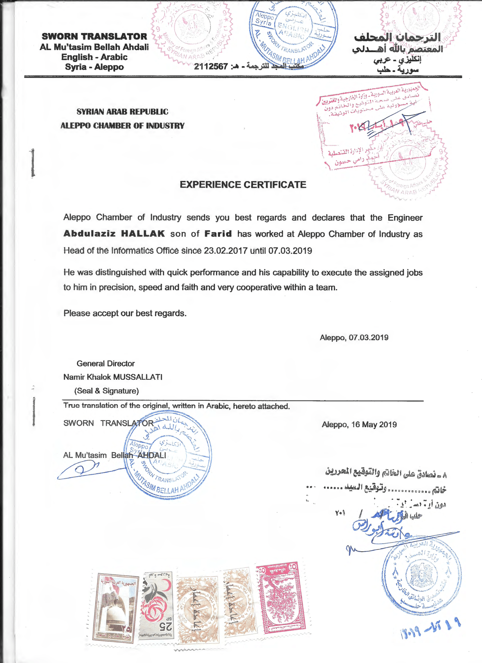 2- Experience as director of the IT Department in the Aleppo Chamber of Industry and I have an experience certificate.